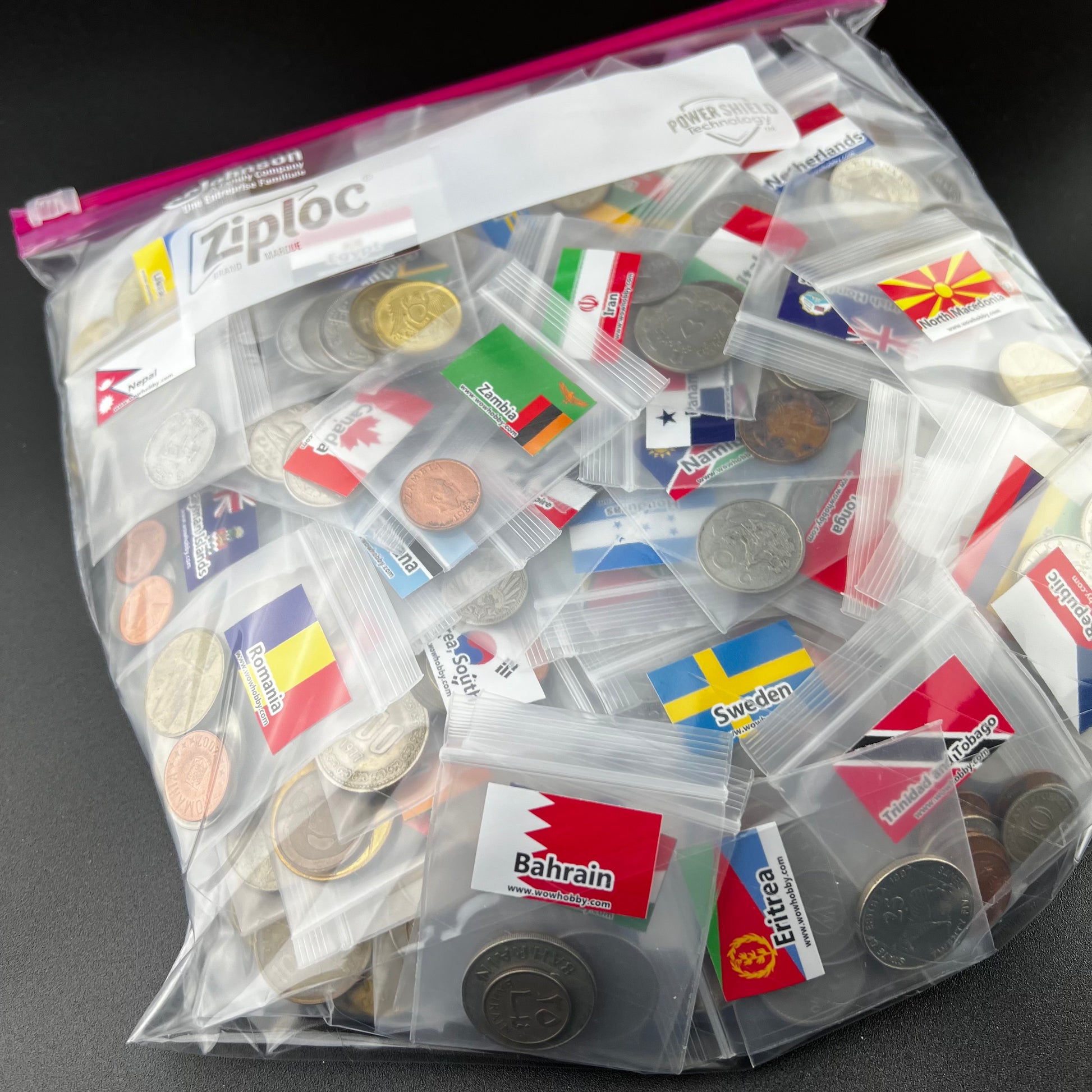 A well-organized collection of different world coins, sorted by country into labeled bags. Each bag includes coins from one country for easy identification. You’ll receive a diverse mix of countries, denominations, and designs – no duplicates within each bag. Great for collectors, educators, or anyone who enjoys exploring the world through coins. All coins are circulated and may show wear.