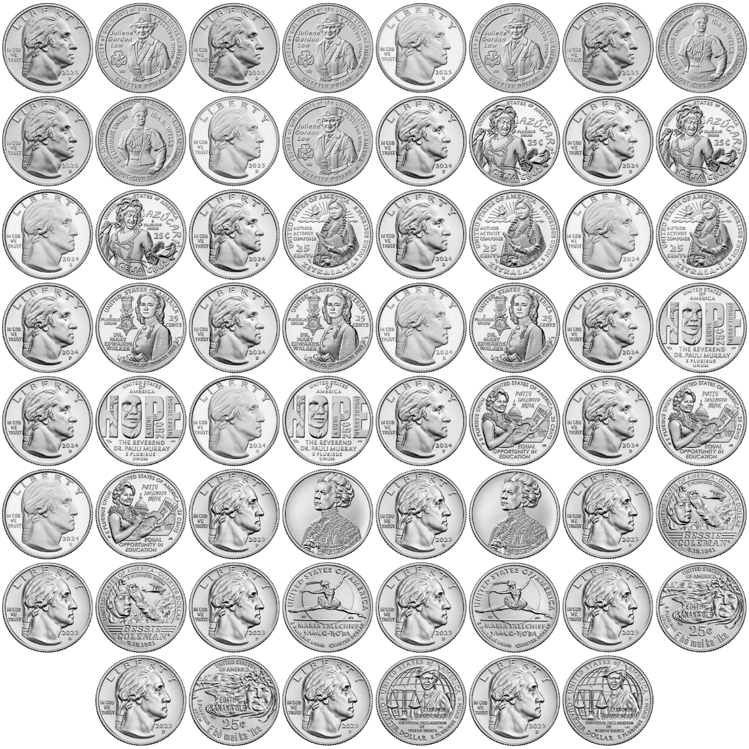 A beautiful set of 31 uncirculated American Women Quarters from the US Mint, featuring coins from 2023, 2024, and 2025 across all three mints – Philadelphia (P), Denver (D), and San Francisco (S). Each coin is in uncirculated condition, straight from mint rolls, offering sharp detail and brilliant finish.
