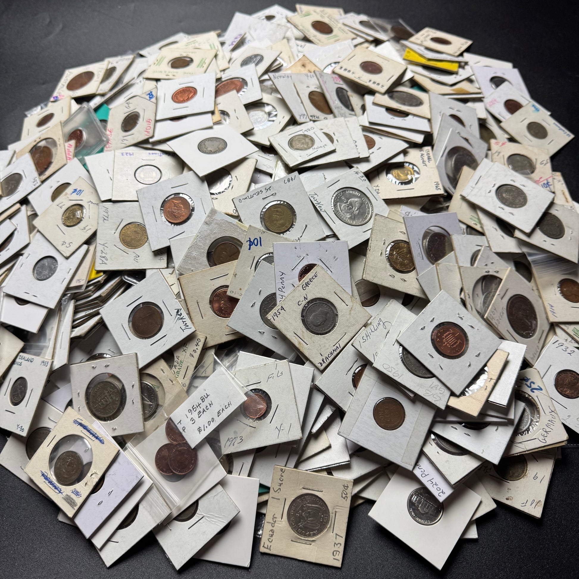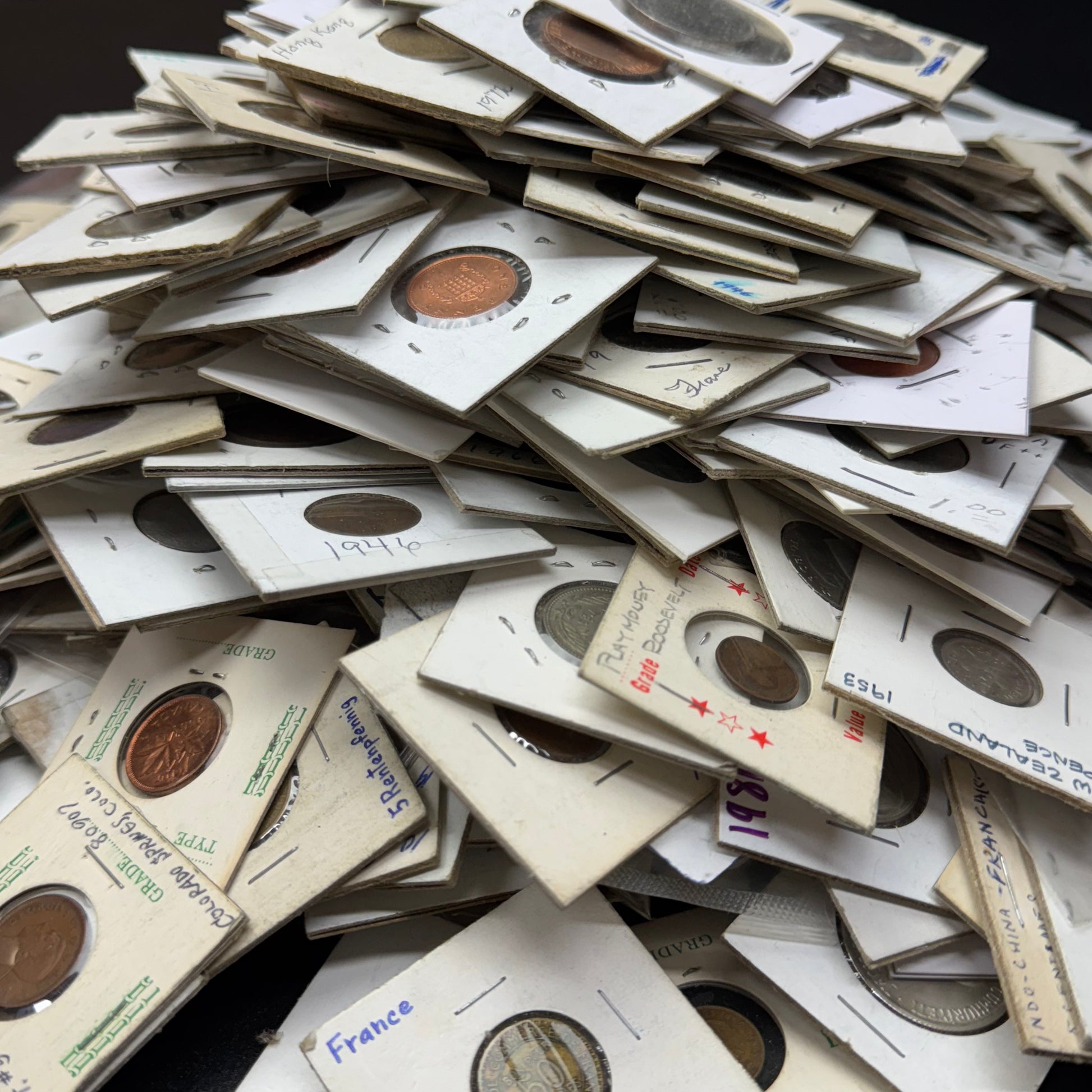 A bulk mix of carded coins – mostly foreign coins with very few U.S. pieces. Each coin is individually placed in a 2x2 cardboard flip for protection and easy storage. You'll find a variety of countries, years, and denominations. Most coins are circulated and may show normal wear. There could also be some tokens included in the mix. A great assortment for collectors, resellers, or anyone who enjoys exploring coins from around the world. All coins are genuine and were collected over time from various sources.