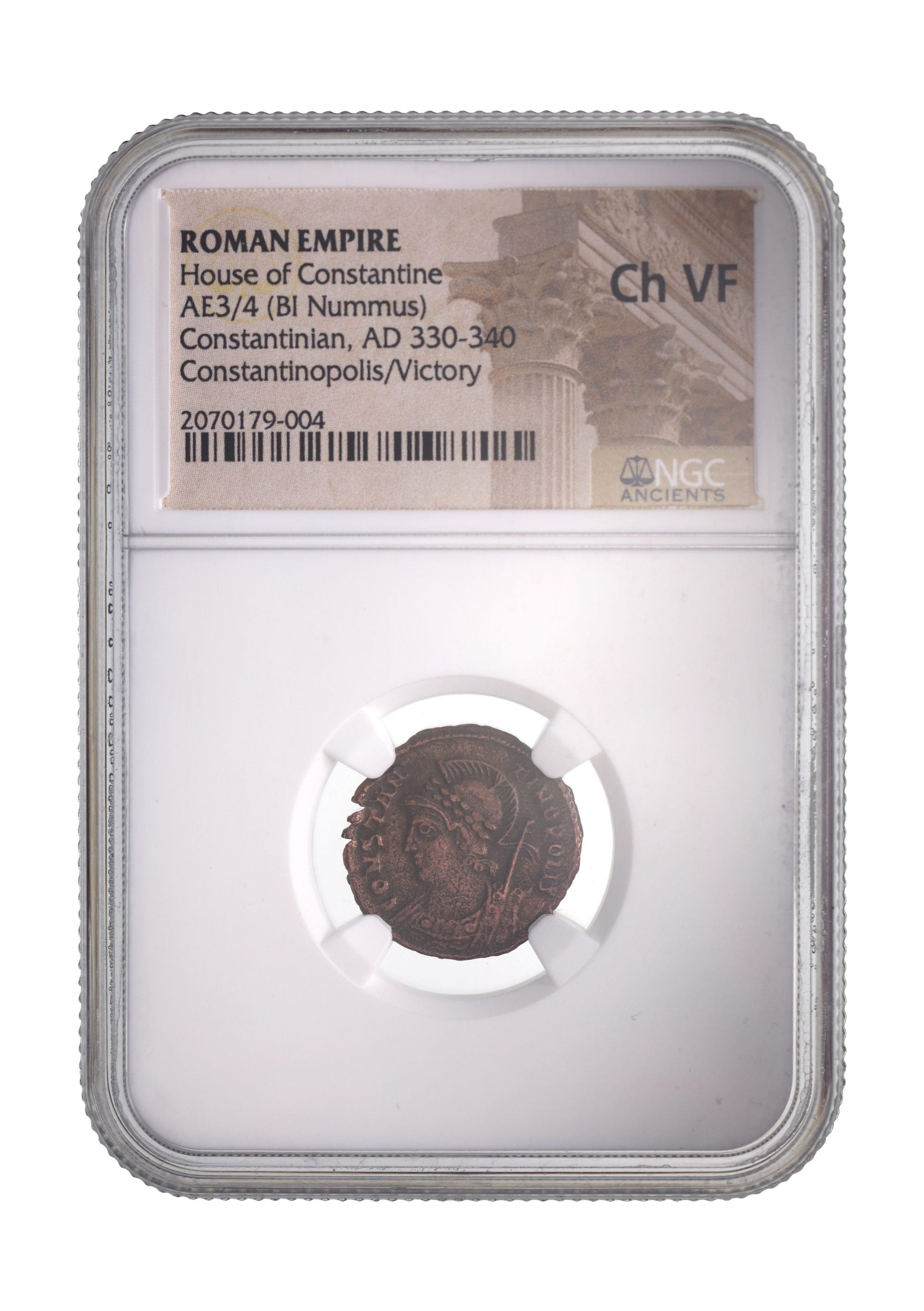 Own a certified Roman AE commemorative coin honoring Constantinopolis (AD 330–340), struck under Constantine the Great and his sons to celebrate the founding of Constantinople. Authenticated and preserved by NGC, this coin marks one of the most pivotal events in Roman—and world—history.