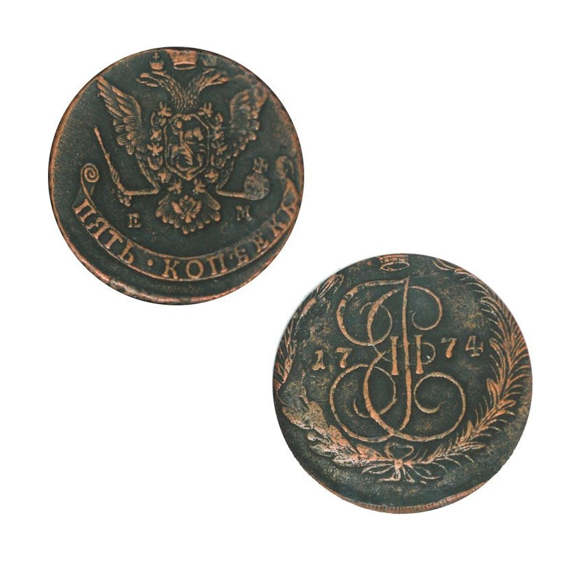 The 5 Kopek coin stands out as the largest copper denomination regularly issued for circulation, weighing an impressive average of 51 grams — nearly twice as heavy as a U.S. silver dollar. With its wide flan and bold design, including the crowned double-headed eagle of the Russian Empire and the imperial cypher of Catherine II, it is a striking and unmistakable artifact of 18th-century Russia.