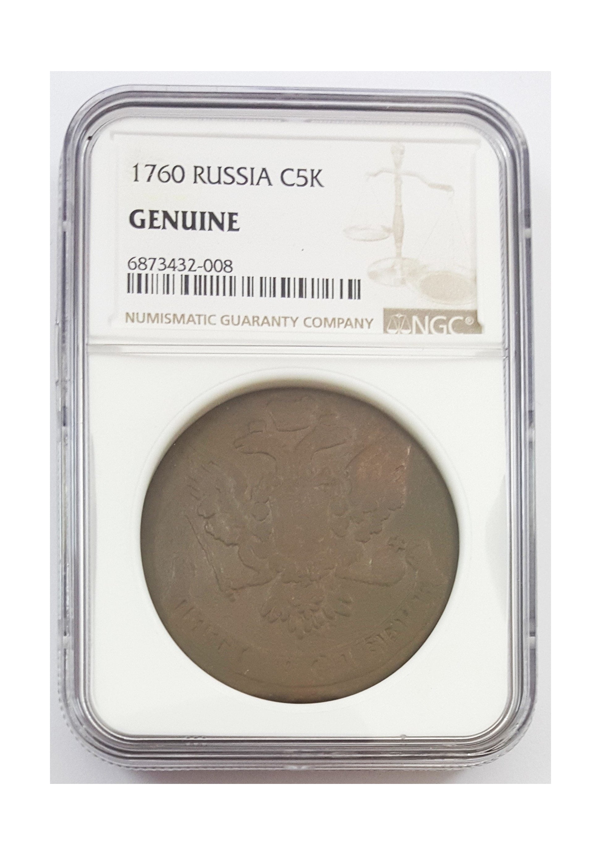 Own a certified 5 Kopek copper coin from the reign of Elizabeth I of Russia (1741–1762), authenticated and slabbed by NGC. This substantial and impressive piece reflects the strength and elegance of one of Russia’s most charismatic rulers.